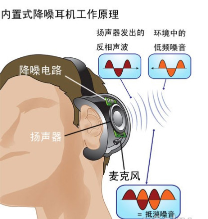 应用原理:降噪耳机,采用主动噪音控制,不同于一般耳机的被动隔音。其原理为: